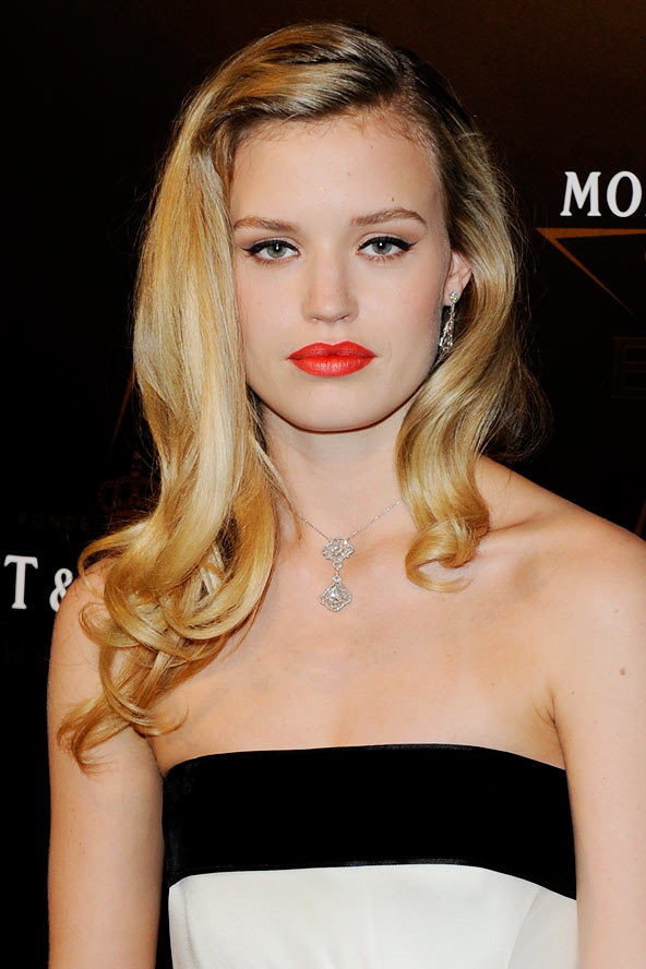 El tono de labios puede ser el que sea, aunque este está muy bonito. El truco aqui está en el iluminador, puedes probar con alguno de NARS, el tono Albatross puede servir, solo debes usar muy poco y debe ir arriba del pómulo, un brochazo ligeramente arriba de donde aplicaste el blush, justo como se ve en la imagen. Un peinado así de relamido con partido se ve bien con este maquillaje, solo que tu outfit no sea muy formal o serio para no verte señorial, algo divertido y con brillo hace un contraste, y a la vez balance, de estilos que funciona muy bien.Mas info del producto iluminador AQUI.